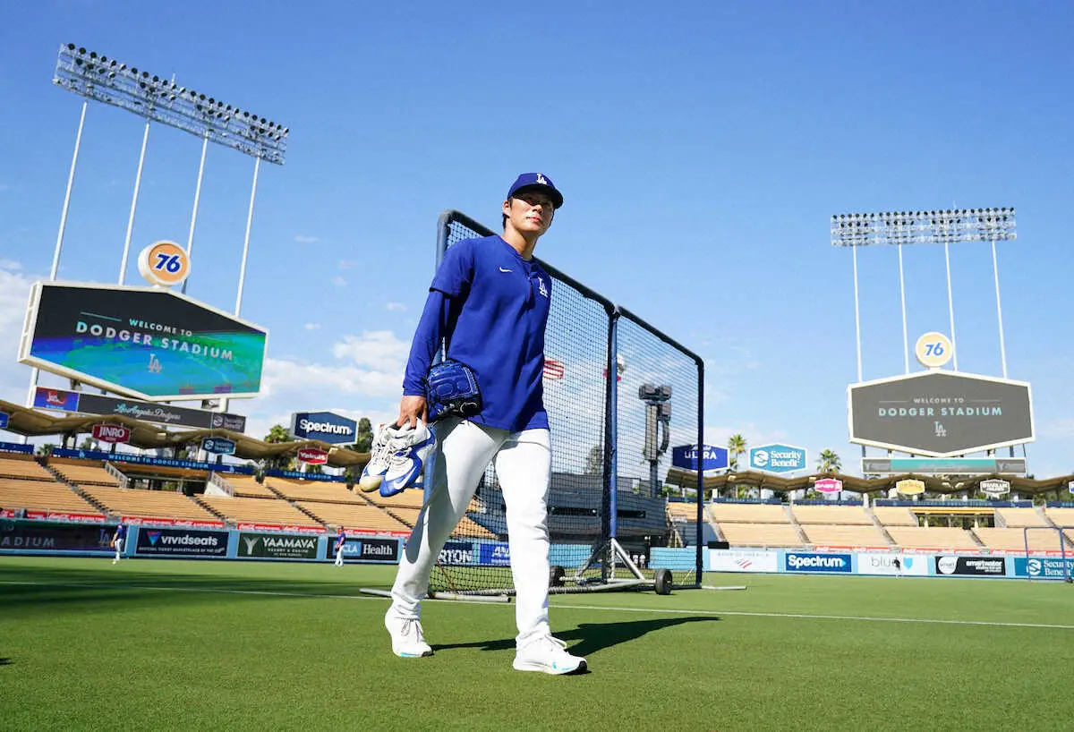 ドジャース由伸「順調!」 試合前にキャッチボールで剛球披露 11日に今永と日米通じて初の投げ合い