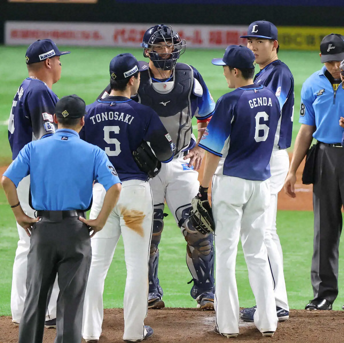 <ソ・西23>5回、マウンド上に集まる武内(右端)ら西武ナイン撮影・岡田 丈靖)