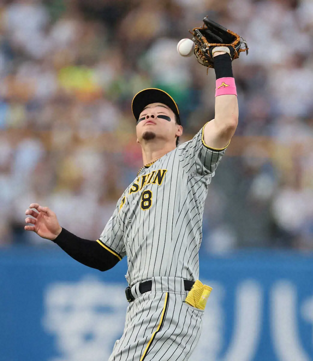 阪神の佐藤輝明内野手(25)が8日、ヤクルト戦(神宮)に「5番・三塁」で先発出場。3回に落球した球が頭に当たりフェアゾーンに落ちるエラーを喫した。