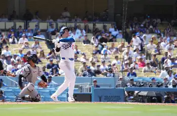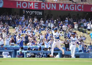 1―0の5回1死走者なしで迎えた第3打席で大谷が特大の一発を放った。右腕バイビーの甘く入ったチェンジアップを捉えると手応えは十分。あとは右翼ポール際の内側か外側かだけの当たりだった。打球速度は116.7マイル(約187.8キロ)、角度は34度。飛距離は450フィート(約137.1メートル)で右翼後方5階席に設置されたブルックリン・ドジャース時代の1955年のワールドシリーズ初制覇を記念する看板に直撃する特大弾だった。大谷は本塁打を確信してダイヤモンドを一周。場内の大型スクリーンには46―46の文字が映し出された。審判団によるビデオ判定もあったが、判定は覆ることなく本塁打と判定され、ベンチで大谷がガッツポーズを見せた。これで打点も101打点で自己最多を更新し、リーグトップのブルワーズ・アダメズに並んだ。