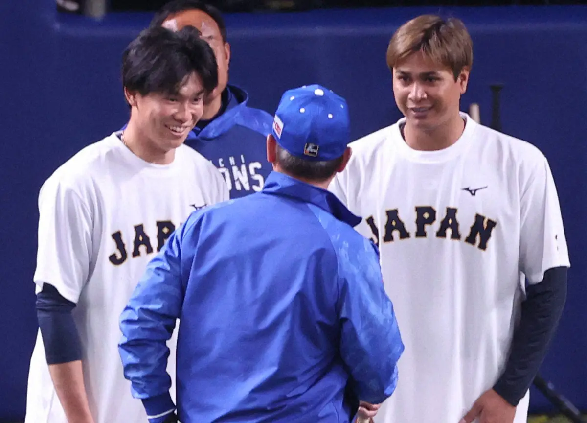 2023年、WBC壮行試合前に中日・立浪監督(中央)にあいさつをする侍ジャパンの湯浅(左)と宇田川