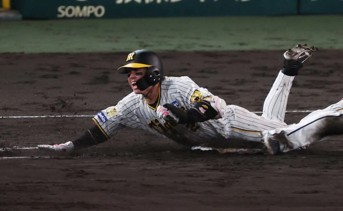 2回2死三塁から東のツーシームを鮮やかに左中間へ運んだ。難攻不落の左腕からもぎ取った貴重な1点で主導権を握ると、3―2の6回先頭では東のグラブをはじく一撃で、一塁へ果敢にヘッドスライディング。木浪、島田の連続バスター安打で三進し、近本の適時打で4点目の生還を果たした。