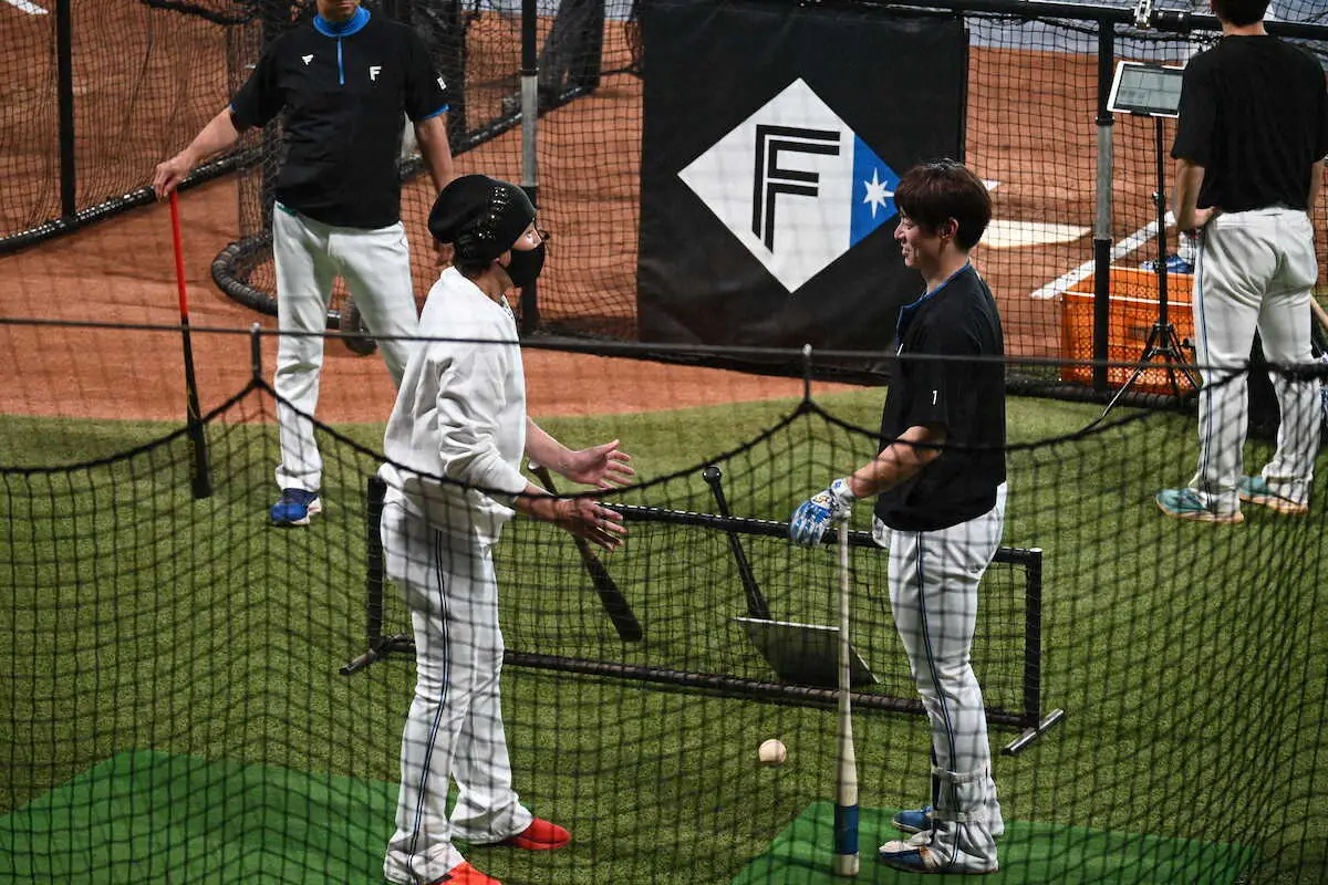 新庄監督は、フリー打撃の前に実施するティー打撃中だった松本剛に歩み寄り、指導を開始。背後からバットを持って「綱引きのように」などとアドバイス。また、構えた際の姿勢なども細かく助言を送った。