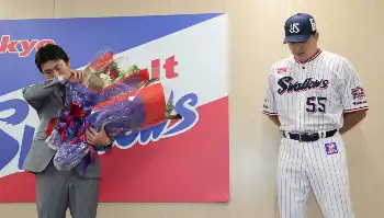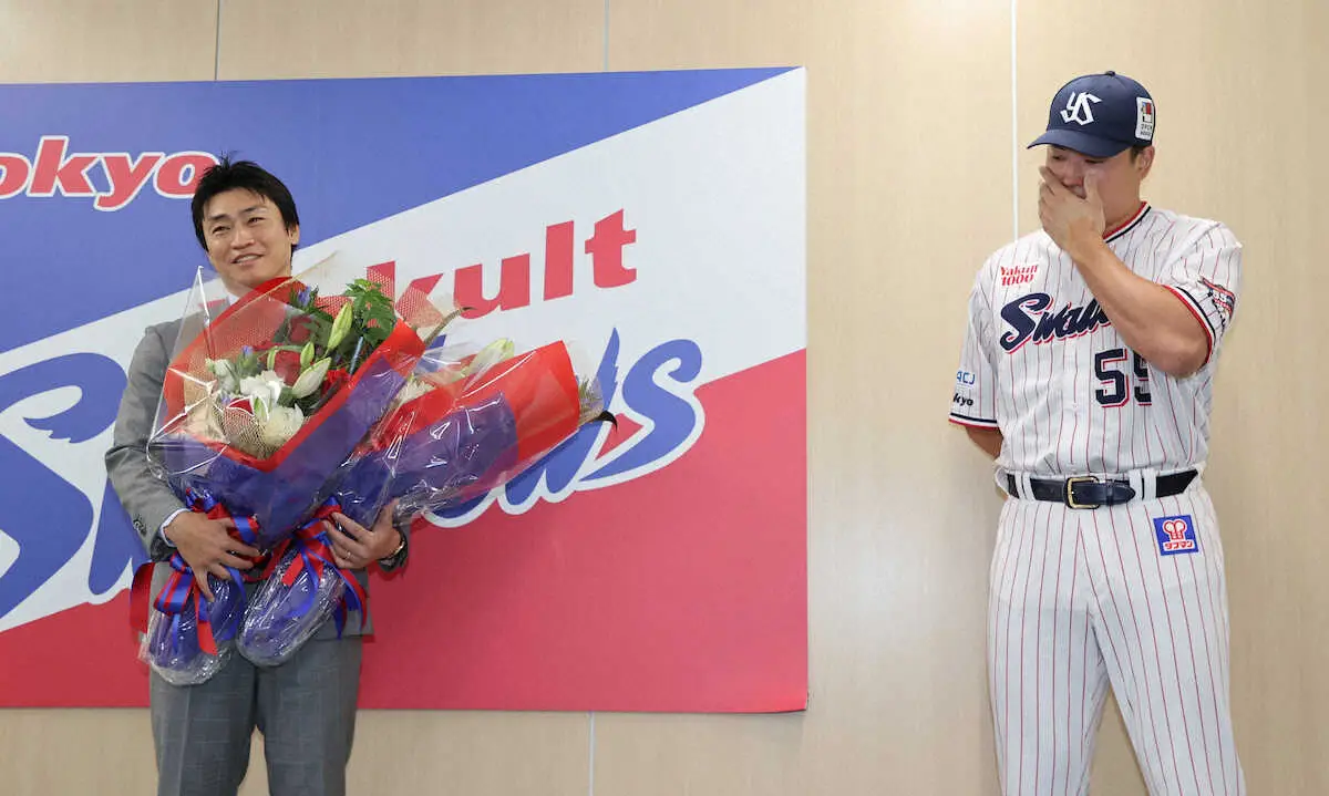 <ヤクルト青木・引退会見>花束贈呈で登場し涙する村上(右)についもらい泣きの青木(撮影・村上 大輔) Photo by スポニチ ヤクルト・村上 青木宣親の引退会見サプライズ登場で号泣「いい野球人生… ギャラリーで見る この記事のフォト 2024年09月13日の画像一覧 もっと見る 2024年09月13日の画像をもっと見る