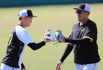 <阪神2軍練習>練習前に福原ファーム投手コーチに話をする秋山(左)=撮影・中辻 颯太