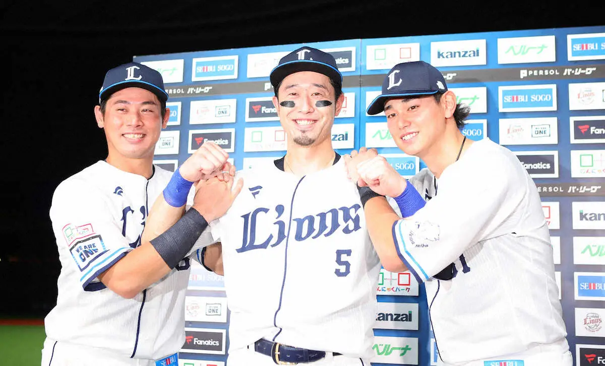 <西・ロ>試合後、笑顔でポーズする(左から)岸、外崎、西川(撮影・白鳥 佳樹)