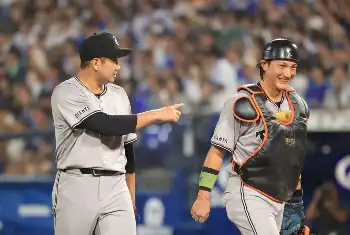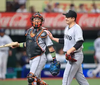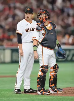 さすがのシンクロ。ベンチの声に同時に振り返る菅野と小林