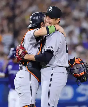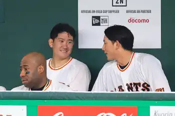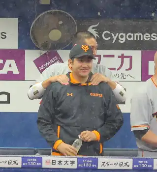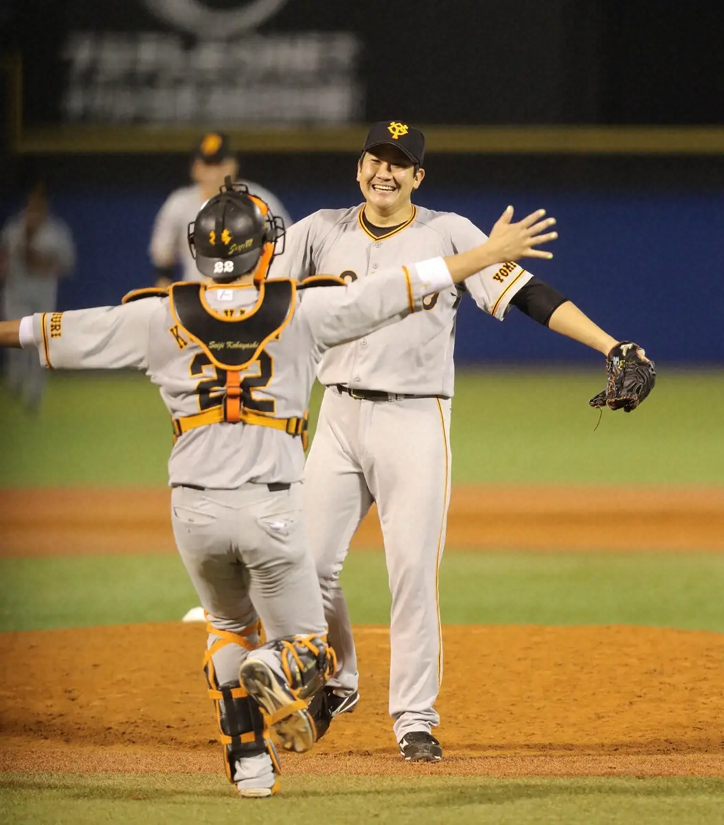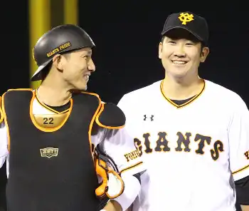 2017年、雨の横浜で降雨コールド勝ち。ベンチで小林が菅野の肩をもみ“お疲れさん”