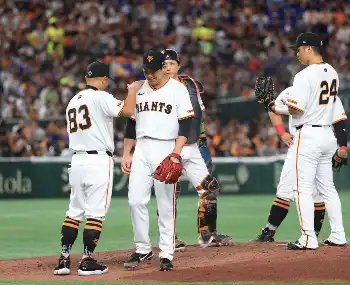 巨人・菅野 中4日で粘投 交代時に阿部監督から謝罪「大城をファーストで使ったのは僕のせい」