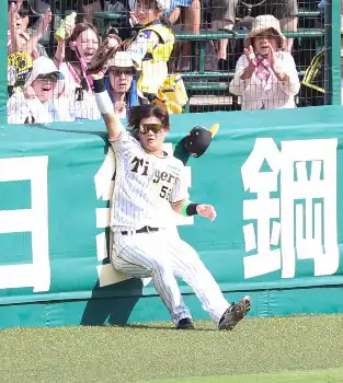 阪神・前川が初回2死満塁でスーパーキャッチ フェンス激突の衝撃で落球寸前も執念でつかみ直す