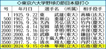 美しい放物線で決めた。6回、小林隼が左翼席にリーグ初本塁打のソロ。ベンチで特別な一発であることを告げられ「びっくりした」。東京六大学野球が始まり100年目。長嶋茂雄、岡田彰布、高橋由伸らが積み重ねてきた本塁打は4000本に到達した。