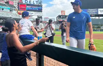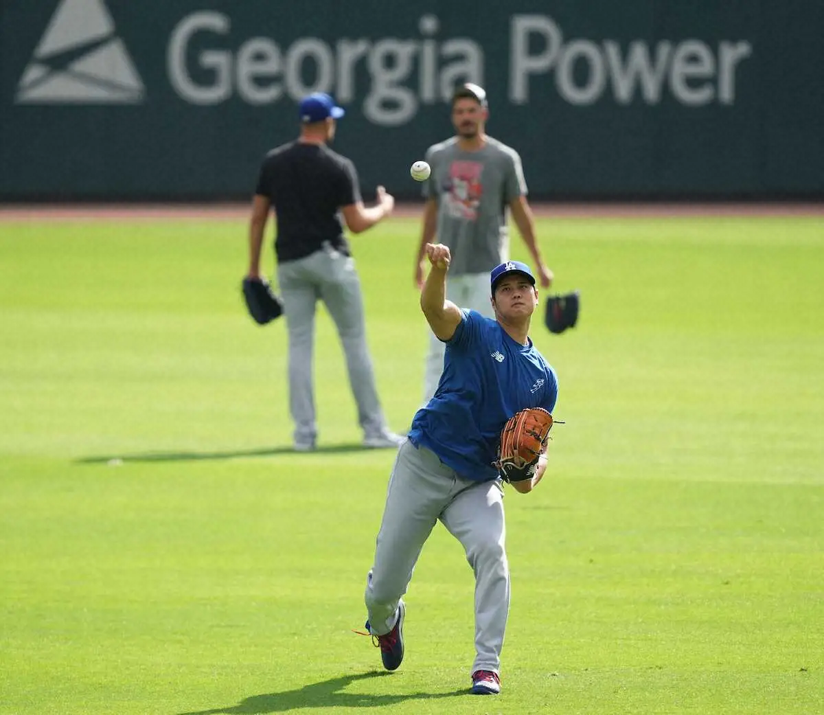 試合前、大谷は30メートルほどの距離で約10分キャッチボール。その後、三塁ベンチ前にいた同僚のフリーマン内野手の息子で15日が8歳の誕生日だったチャーリーくんに「Happy Birthday!! Charlie!!」と祝福した。