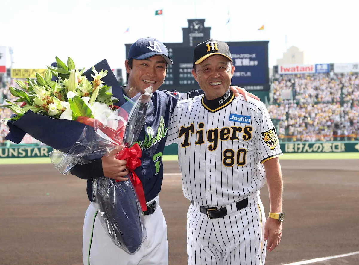 スタンドから大きな拍手を浴びたベテランは「大先輩の岡田監督に花束を頂き恐縮です。肩を組んで撮らせてもらった写真は一生の宝物」と感謝した。