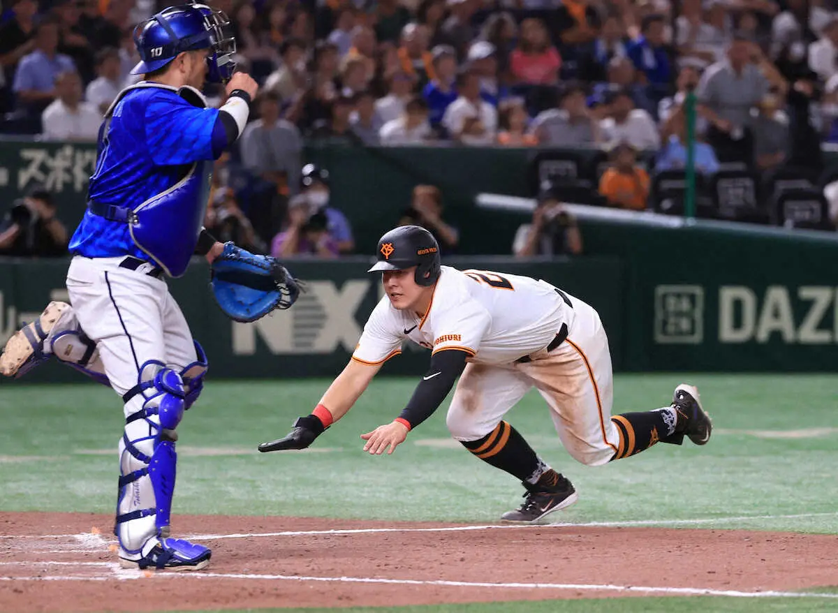 巨人は18日、東京ドームでDeNAと対戦。1点を追う8回に岡本和真内野手(28)の執念のヘッドスライディングで同点に追いついた。