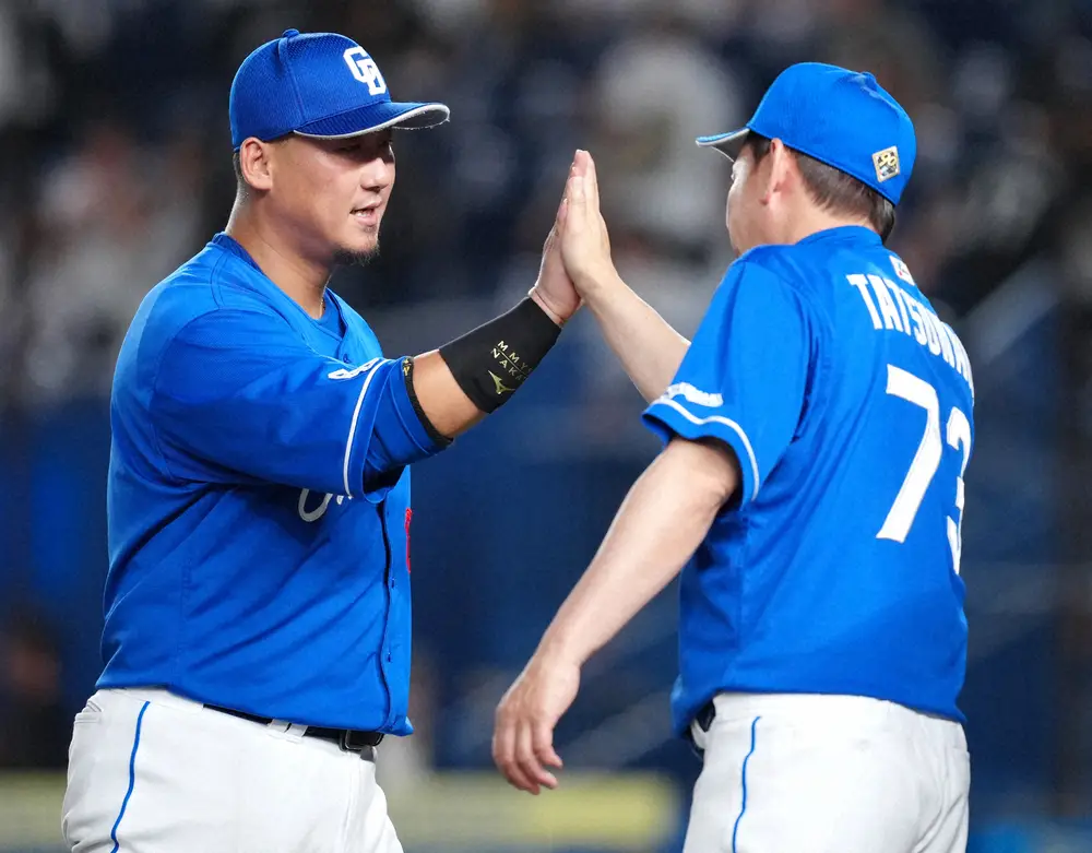 立浪監督とハイタッチする中田翔(左)