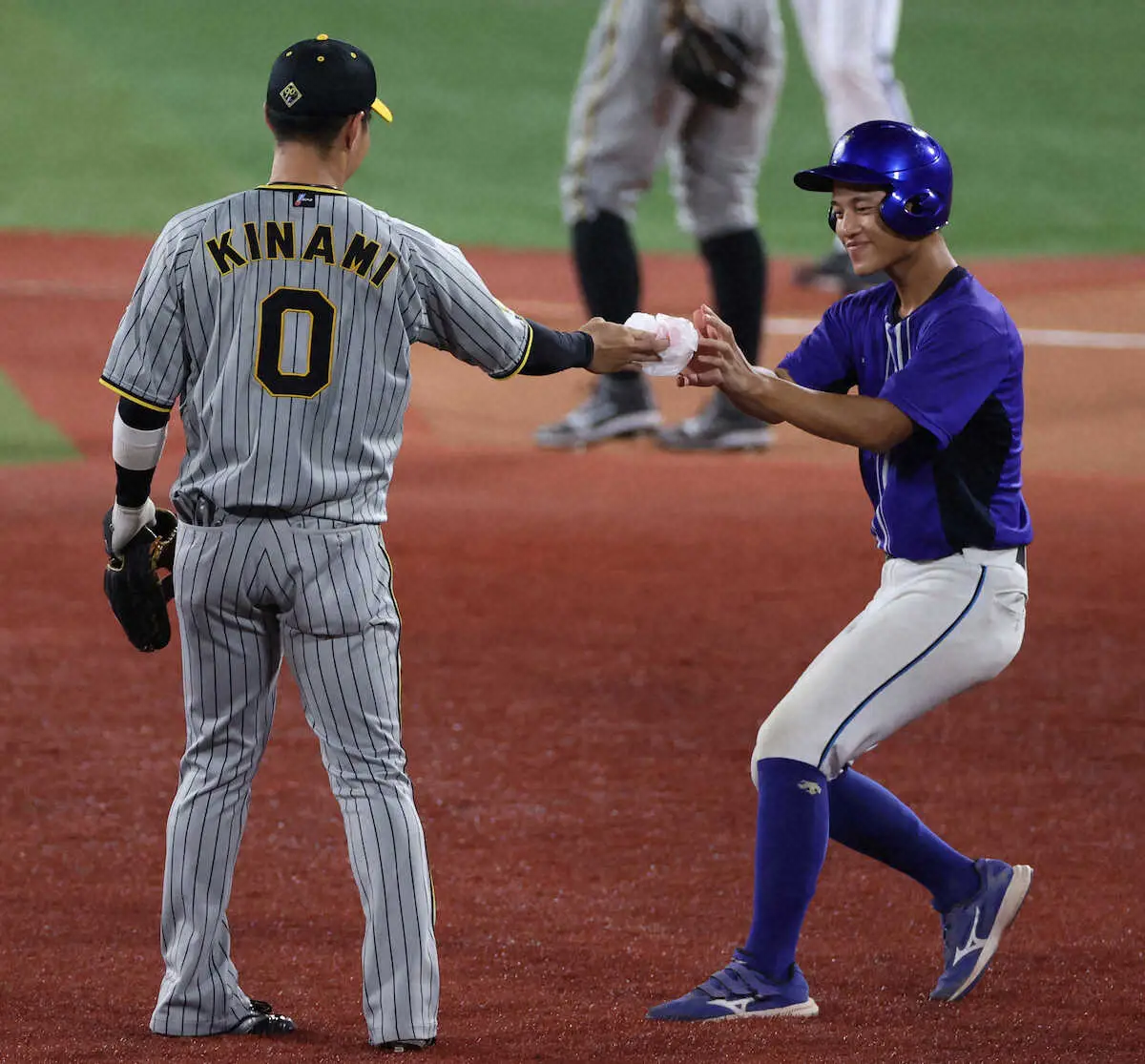 <D・神> 6回、風で飛ばされた袋をキャッチし、ボールボーイに渡す阪神・木浪(左) (撮影・須田 麻祐子)