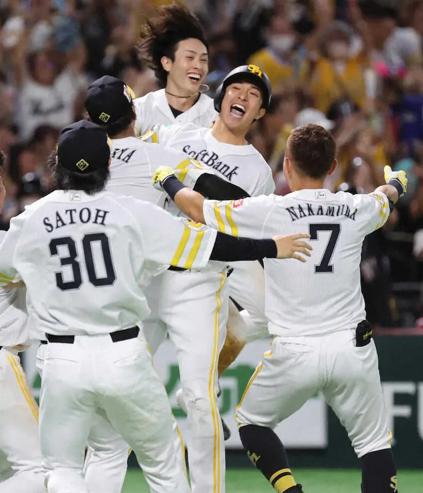 その柳町が会心の一打で試合を決めた。前進守備を敷いていた左翼手の頭上を越える逆転サヨナラの2点適時三塁打だ。堂々のヒーローとなった背番号32は「最近、僕自身の成績もふがいなくモヤモヤしかなかった。今日みたいな大事な場面で打てたことは自信になります。最高でした。(監督も)凄く両手を上げて喜ばれていたので。僕もはしゃいでしまいました」と声を弾ませた。
