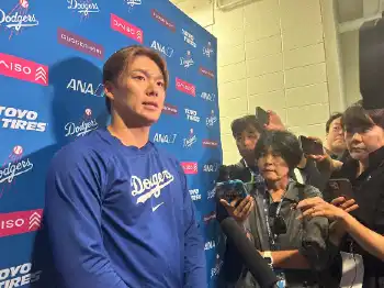 試合前に取材に応じるドジャース・山本(撮影・柳原 直之)