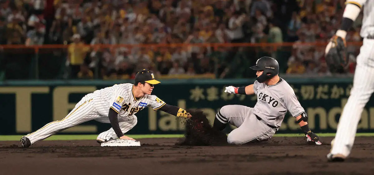 先発の才木が先頭・丸に右翼線二塁打を許し、無死二塁。ここで、21日広島戦で決勝点につながる失策を犯した2番・浅野がバントを試みるも、打球は才木の正面へ転がった。才木はすぐさま三塁へ送球し、佐藤輝、遊撃・木浪と挟殺して丸を刺し、この間に二進を狙った浅野も、二塁・中野の絶妙なカバーリングもあって二塁で刺した。