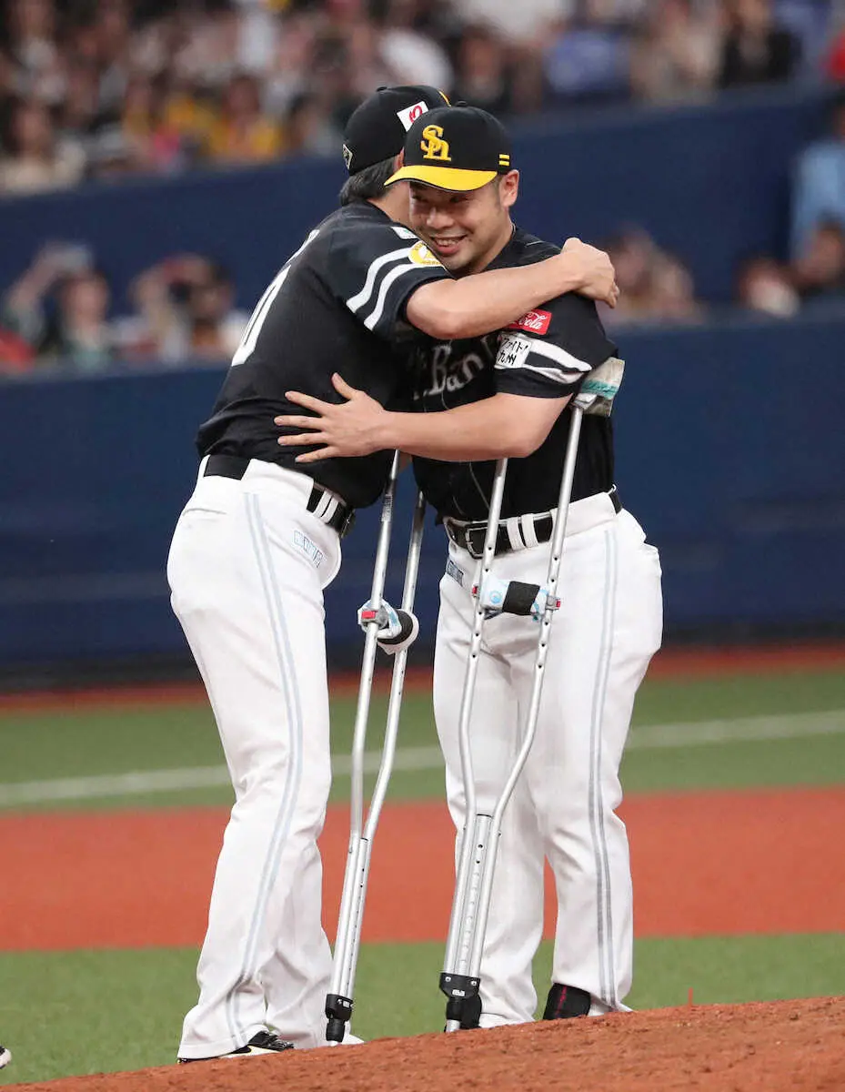 <オ・ソ23>松葉杖をつきながら喜びの輪に加わる近藤(左上)(撮影・岸 良祐) Photo by スポニチ 右足首負傷のソフトバンクの近藤が松葉杖姿で歓喜の場に 「今度は日本一… ギャラリーで見る この記事のフォト 2024年09月23日の画像一覧 もっと見る 2024年09月23日の画像をもっと見る
