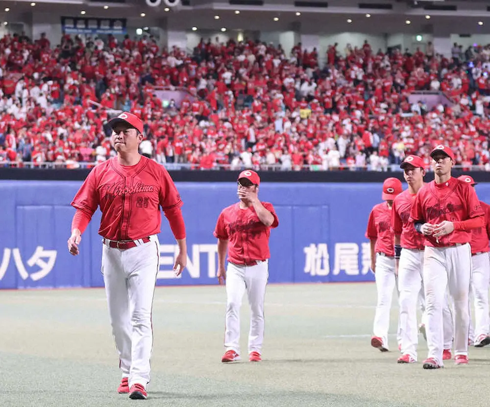 <中・広>今季バンテリンドーム最終戦を終え、引き上げる広島・新井監督(左)ら(撮影・椎名 航)