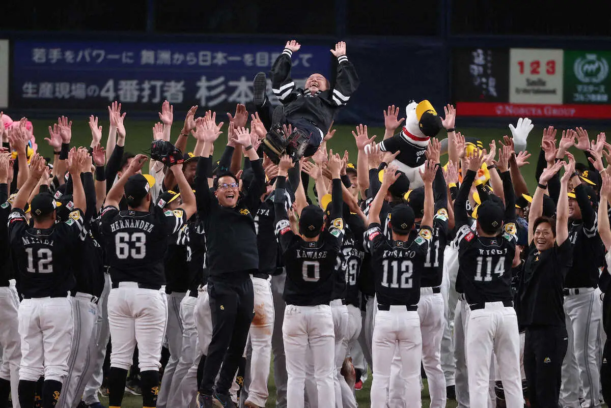 そして選手たちはマウンド付近に集まり、小久保監督を8度胴上げ。続いて孫正義オーナーが輪の中心に迎えられ、ナインの手で6度宙を舞った。SNSでは「孫オーナーの胴上げ、みんなすごい慎重になってるのおもろい」「丁寧に胴上げされる孫オーナーなんか可愛い」「孫オーナーの胴上げって緊張するわ!」「監督だけじゃなくて、孫オーナーも胴上げするって!!ホントにいいチーム」の声も上がった。