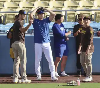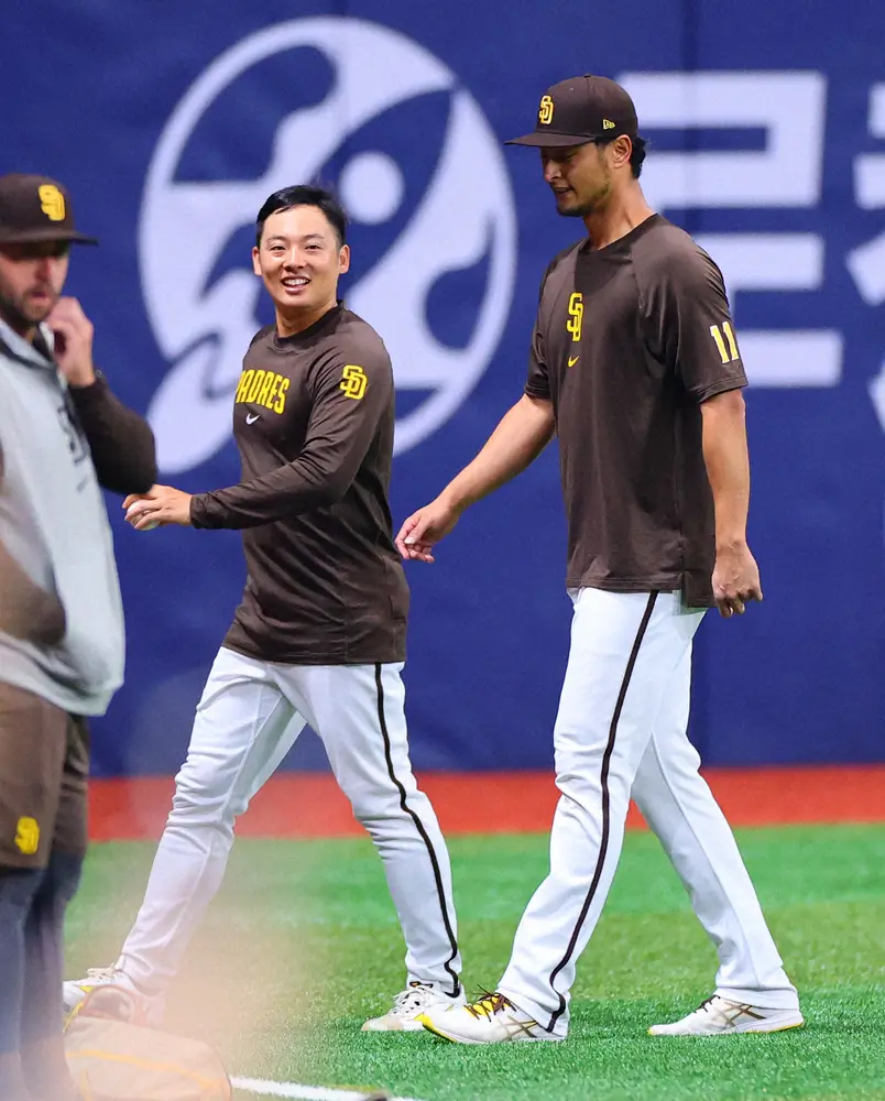 試合前に談笑する(前列左から)パドレスのダルビッシュ、ドジャース・大谷、パドレス・松井=ロサンゼルス(共同) Photo by 共同 パドレスPO進出決定にダル「まだドジャースを追いかけている段階」松井は… ギャラリーで見る この記事のフォト 2024年09月25日の画像一覧 もっと見る 2024年09月25日の画像をもっと見る