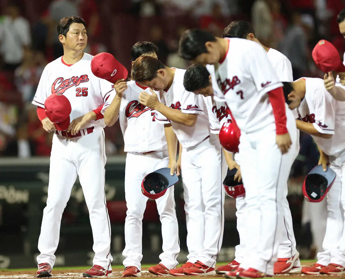 広島は25日、ヤクルトに敗れて3連敗。65勝65敗5分けとし、今季最多14あった貯金がついに0になった。今季残り8試合で、自力でのCS出場が消滅し、3位・DeNAが巨人に勝ったため、ゲーム差は1・5に広がった。