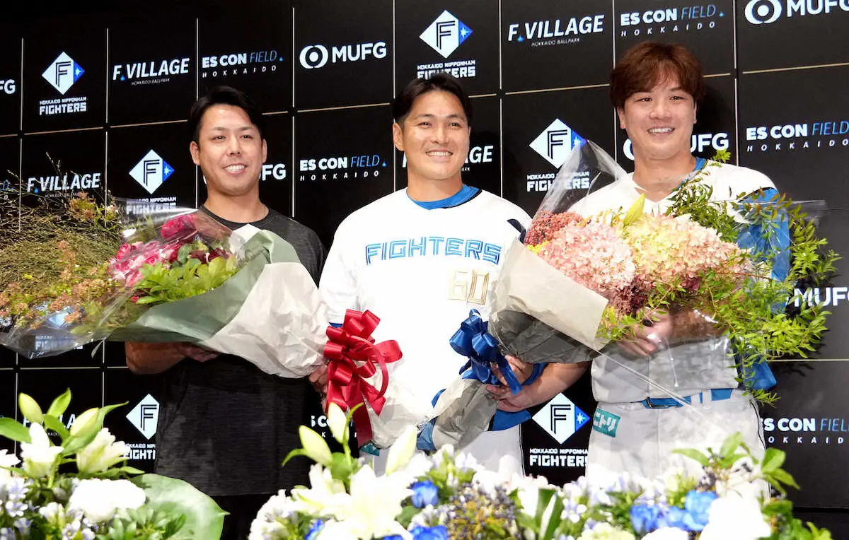 会見後にはサプライズでともに同学年で北海道出身の伏見と、元巨人、日本ハムで活躍した北山進マネジャー(34)から花束を贈呈された。伏見は東海大四、北山は駒大苫小牧出身で高校時代にしのぎを削った仲間からねぎらいの言葉をもらった鍵谷は「もうやりきりました。おなかいっぱいです」と、涙はなかった。