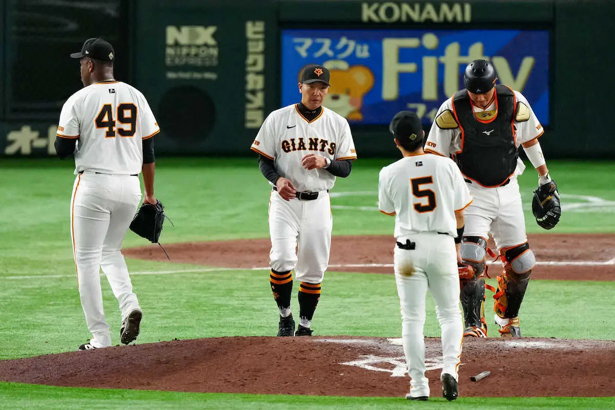 <巨・中>8回途中、バルドナード(左)から大勢へ継投する阿部監督(中央)(撮影・会津 智海)