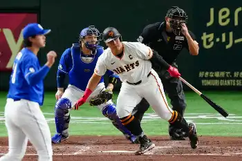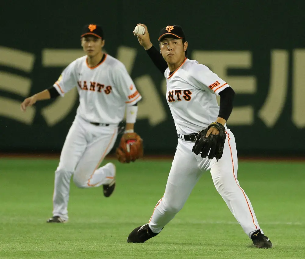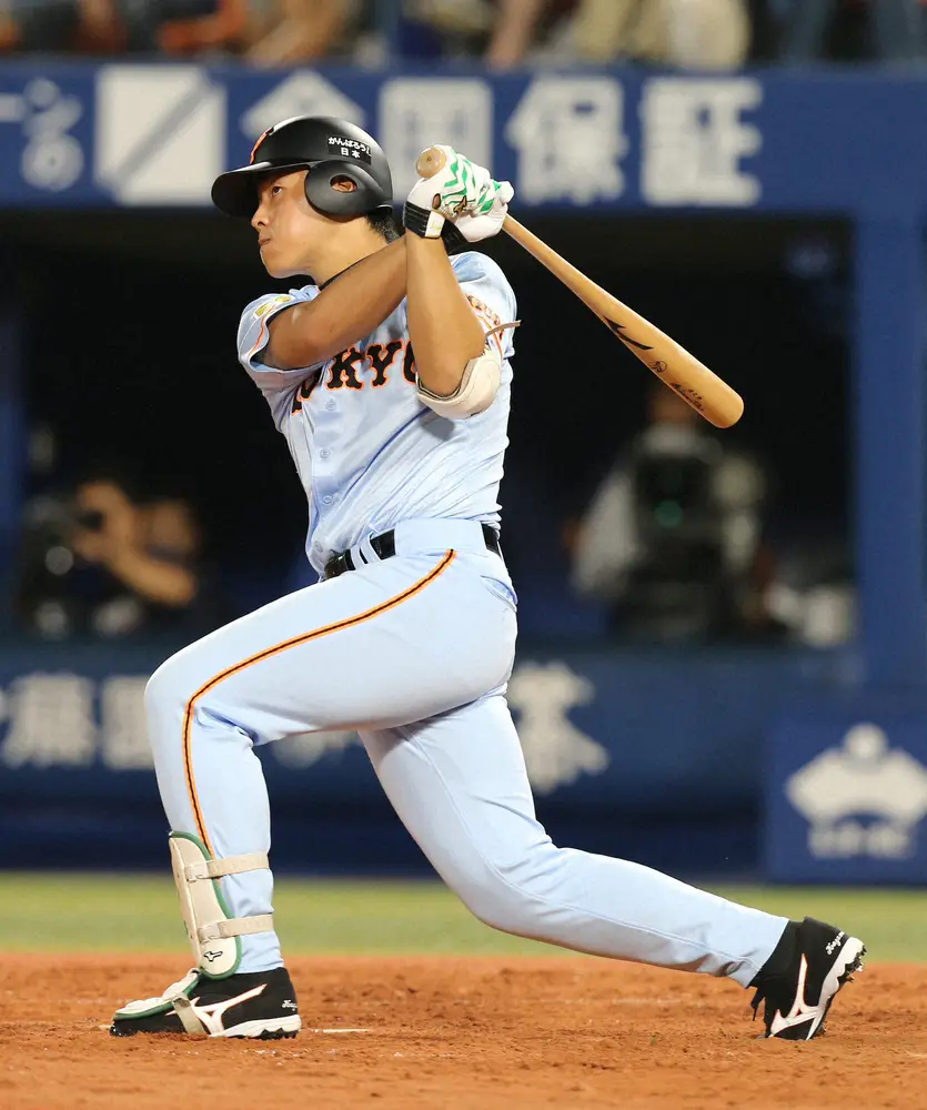 <巨・中>6回、岡本和は先制適時打を放つ(撮影・西川祐介)