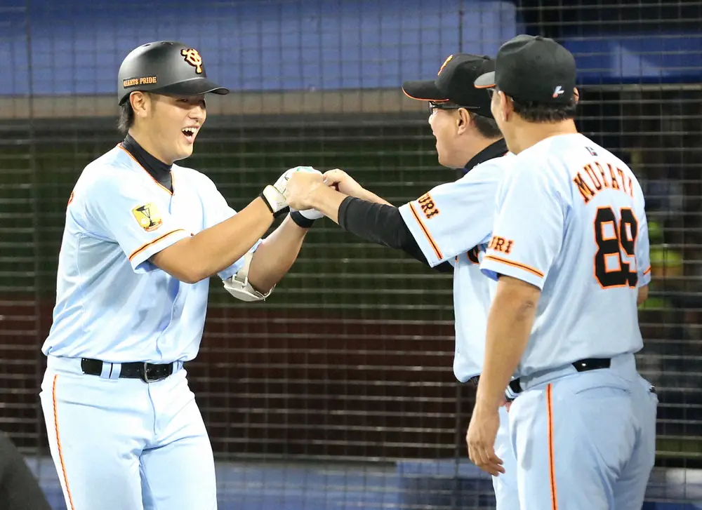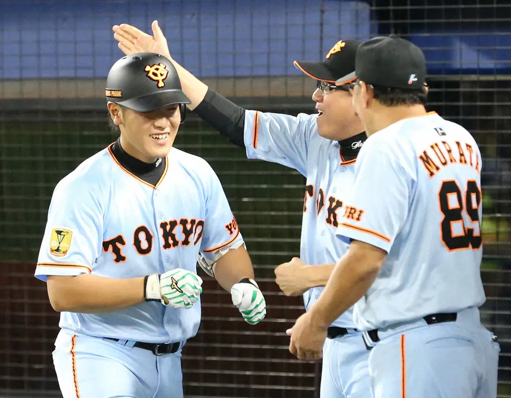 2015年9月5日、横浜スタジアムでのDeNA戦でプロ初安打初本塁打となる1号2ランを放ち、原辰徳監督(中央)に迎えられる代打・岡本和真内野手(左)