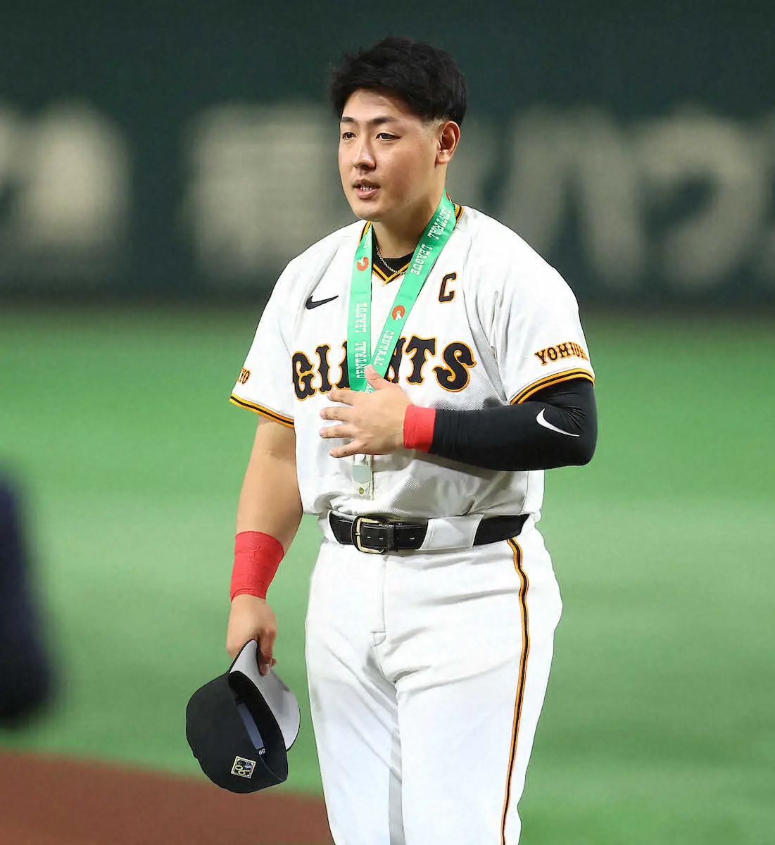 <巨・中>通算1000試合出場を達成し表彰された巨人・岡本和(撮影・松永 柊斗)