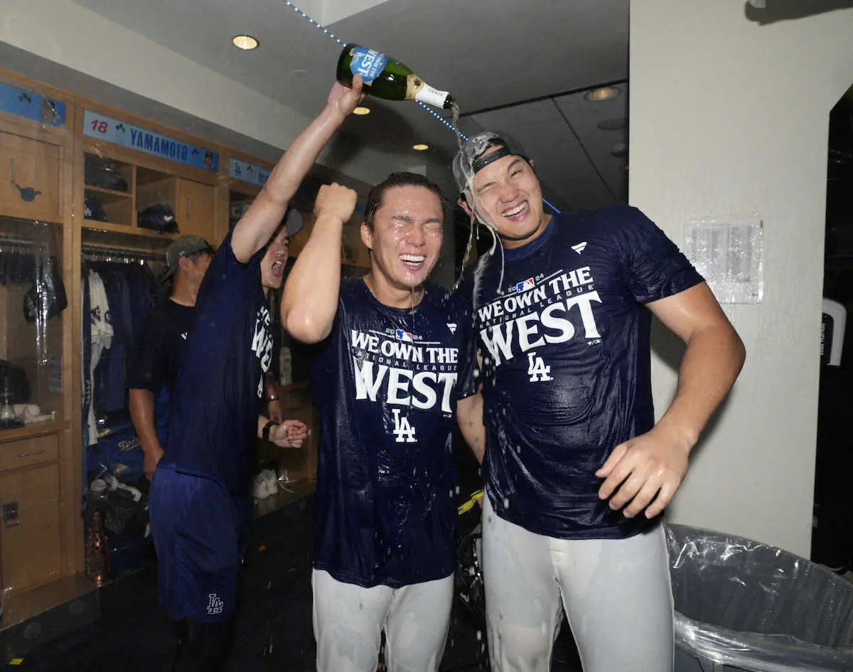 思う存分、シャンパンを浴びた。ドジャース・山本はメジャー移籍1年目で歓喜を味わい「最高にうれしい。1年目から優勝を経験させてもらえることはなかなかない。本当にチームメートに感謝」と声を弾ませた。
