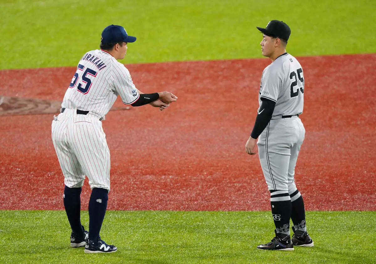 <ヤ・巨>言葉を交わす村上(左)と岡本和(撮影・木村 揚輔)