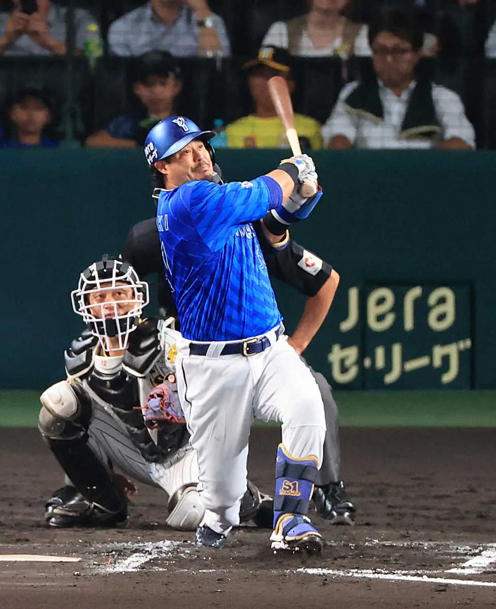 0―0の6回1死一塁で代打で登場。村上の内角速球を左翼ポール際に飛ばした3球目はわずかにファウルでリプレー検証でも覆らなかったが、再び来た内角速球をほぼ同じ弾道で打ち返すと、これはポールの内側から左翼席へ。“打ち直し”の14号2ランが決勝打となった35歳は「考える間もなかったので、とにかく前に飛ばそうと思った」と白い歯を見せた。