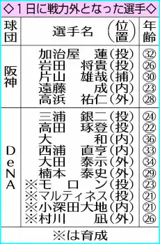 1日に戦力外となった選手 Photo by スポニチ DeNAが大和、大田、西浦ら10選手に戦力外通告 阪神は加治屋ら5選手に ギャラリーで見る この記事のフォト 2024年10月02日の画像一覧 もっと見る 2024年10月02日の画像をもっと見る