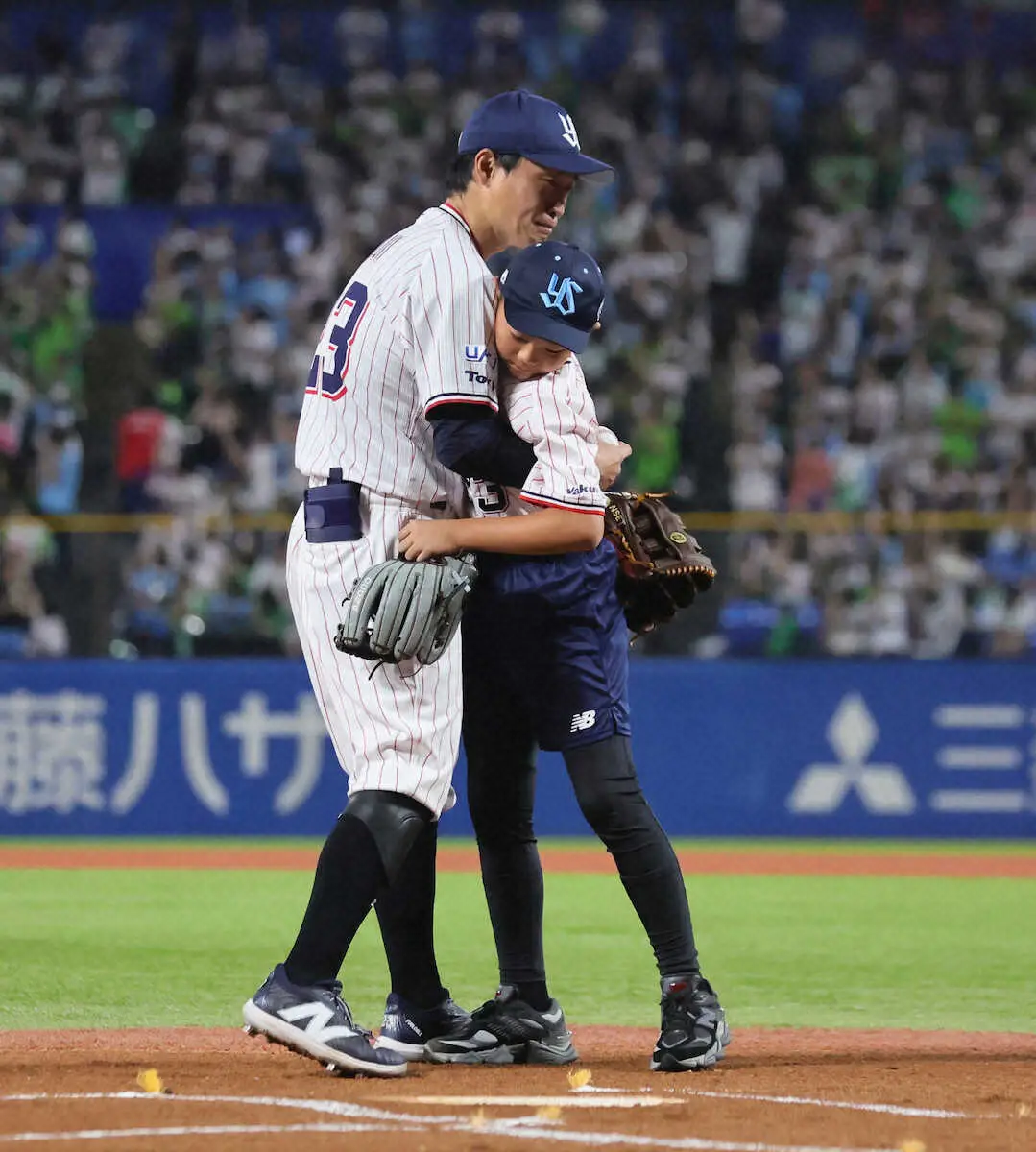 <ヤ・広>始球式を行った長男と抱き合う青木(撮影・尾崎 有希)