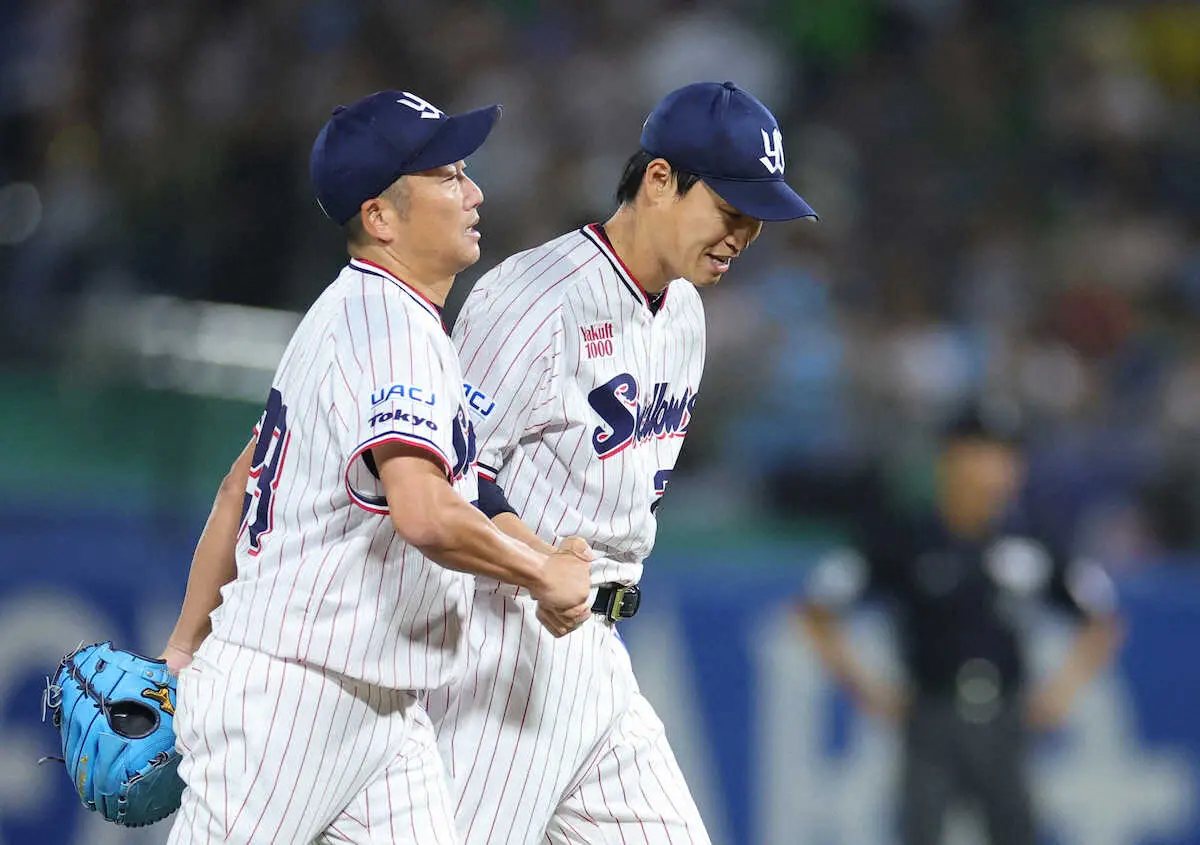 <ヤ・広>7回を終え握手をかわす石川(左)と青木 (撮影・白鳥 佳樹)