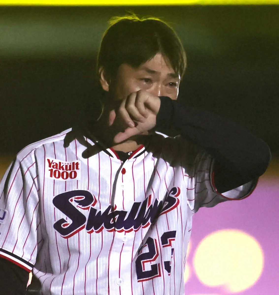 <ヤ・広>セレモニーで号泣する青木(撮影・尾崎 有希)