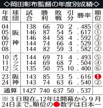 【虎将最多552勝】○…岡田監督は阪神監督として通算552勝で、藤本定義の514勝を上回り球団最多。勝率.566は、阪神通算500試合以上では松木謙治郎の.567に次ぐ数字。オリックス時代を含む通算740勝はプロ野球歴代19位。
