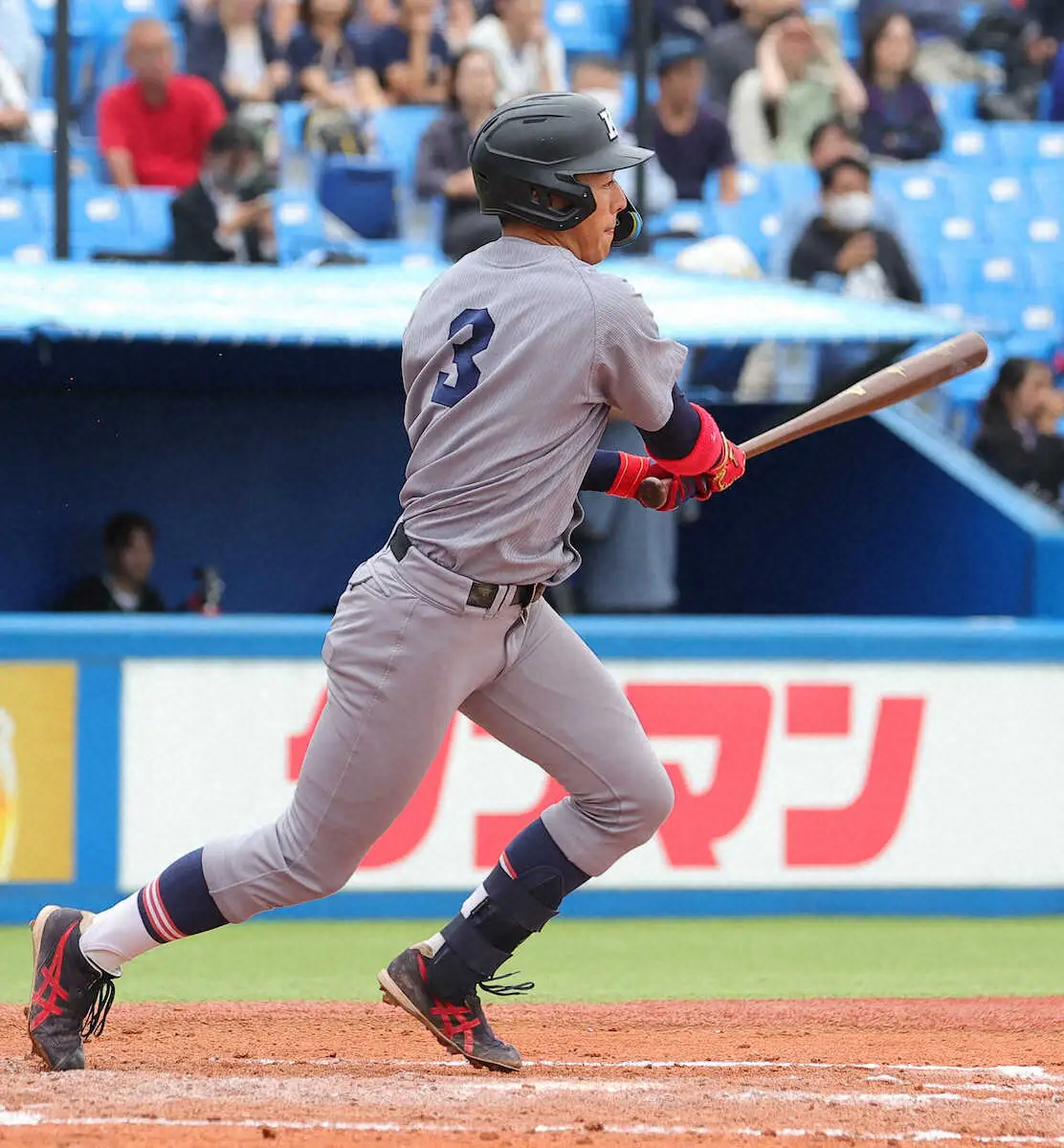 <東大・慶大>9回、安打を放つ清原(撮影・藤山 由理)