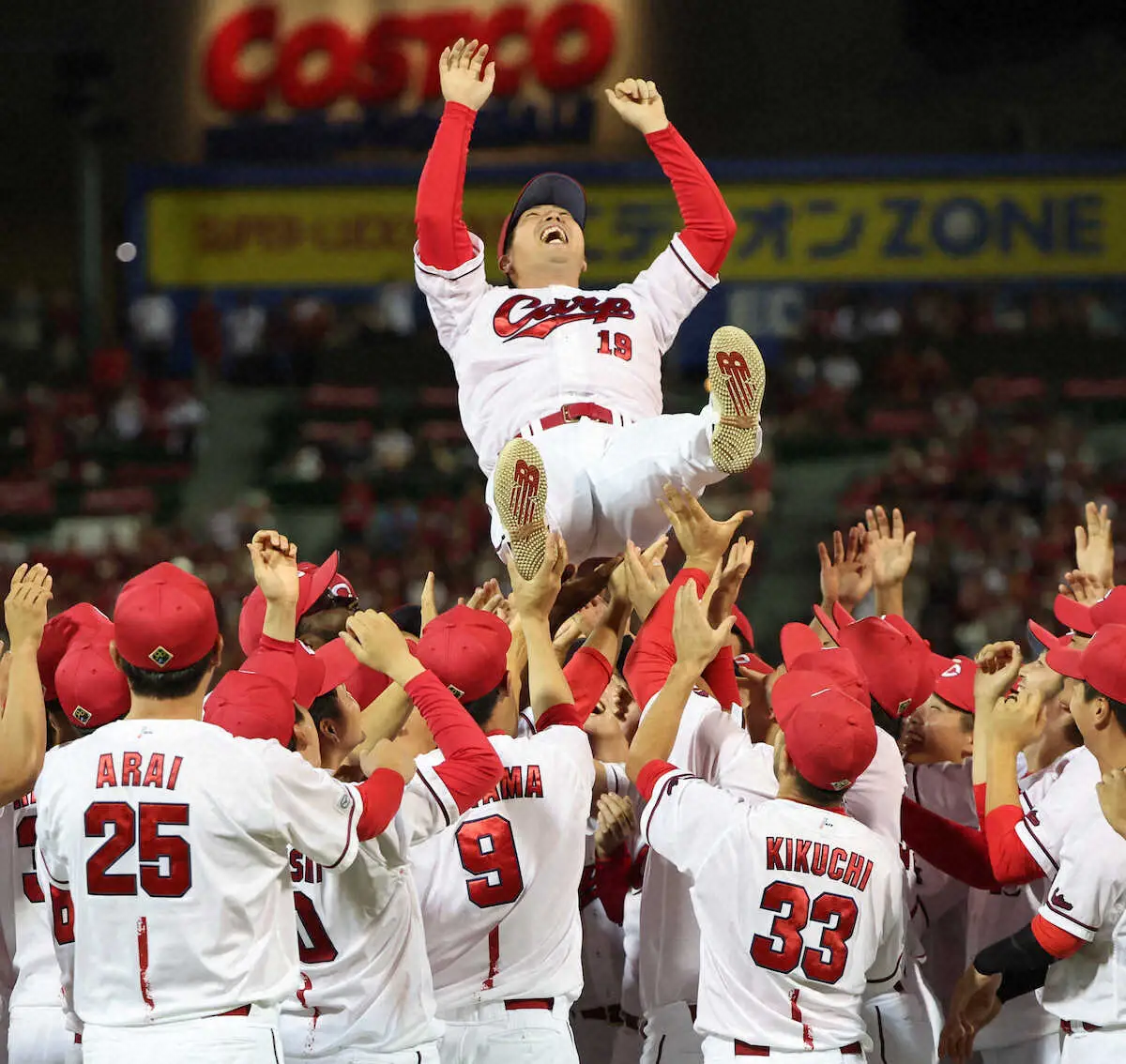 試合後のセレモニーには広陵高・中井哲之監督、明大時代の監督だった善波達也氏の恩師2人がサプライズ登場。花束を贈られた。「良いときもありましたが、皆さまの温かい応援や支えがあったからこそ、ここまで頑張って来られた。13年間カープでプレーできたことを誇りに思います」。チームメートによる胴上げで7度宙に舞った。先発一筋で駆け抜けた13年。惜しまれつつ背番号19のユニホームを脱いだ。 (長谷川 凡記)