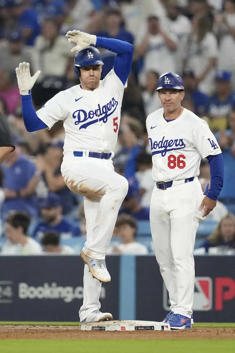 パドレスとの第1戦の3回、安打を放ちポーズを決めるドジャース・フリーマン(左、AP)