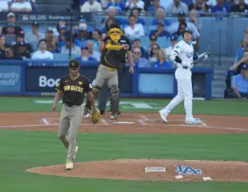 初回の攻撃で2番タティスの本塁打が生まれて幸先よく先制した。場内が大いに盛り上がった初回の大谷との対戦。カットボール、カーブ、スイーパー、速球と第1打席からさまざまな球種を駆使してカウント1―2と追い込むと最後はスイーパーがやや抜けた形で外角低めに沈み、空振り三振に打ち取った。2番ベッツには初球のスイーパーを捉えられて左翼への大飛球。左翼プロファーがフェンス際でジャンプし、ベッツも一発を確信して一度は手を挙げたほどだったが、実はスーパーキャッチ。打球を眺めていたダルビッシュも安どの表情を浮かべた。3番フリーマンも空振り三振に仕留め、通算6度、12度目のPS登板らしく落ち着いた投球を披露した。