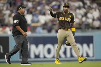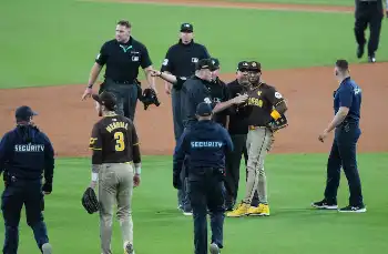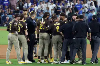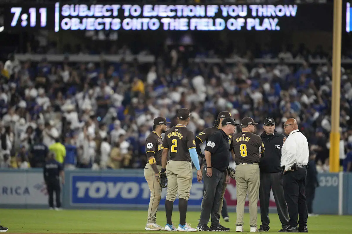 ドジャースとパドレスのナ・リーグ地区シリーズは6日(日本時間7日)、ドジャースタジアムで第2戦が行われ、パドレスが6本塁打で圧倒し大勝。対戦成績を1勝1敗に戻した。試合中には観客がグラウンドに物を投げ込み、試合が中断する異例の事態が起きた。