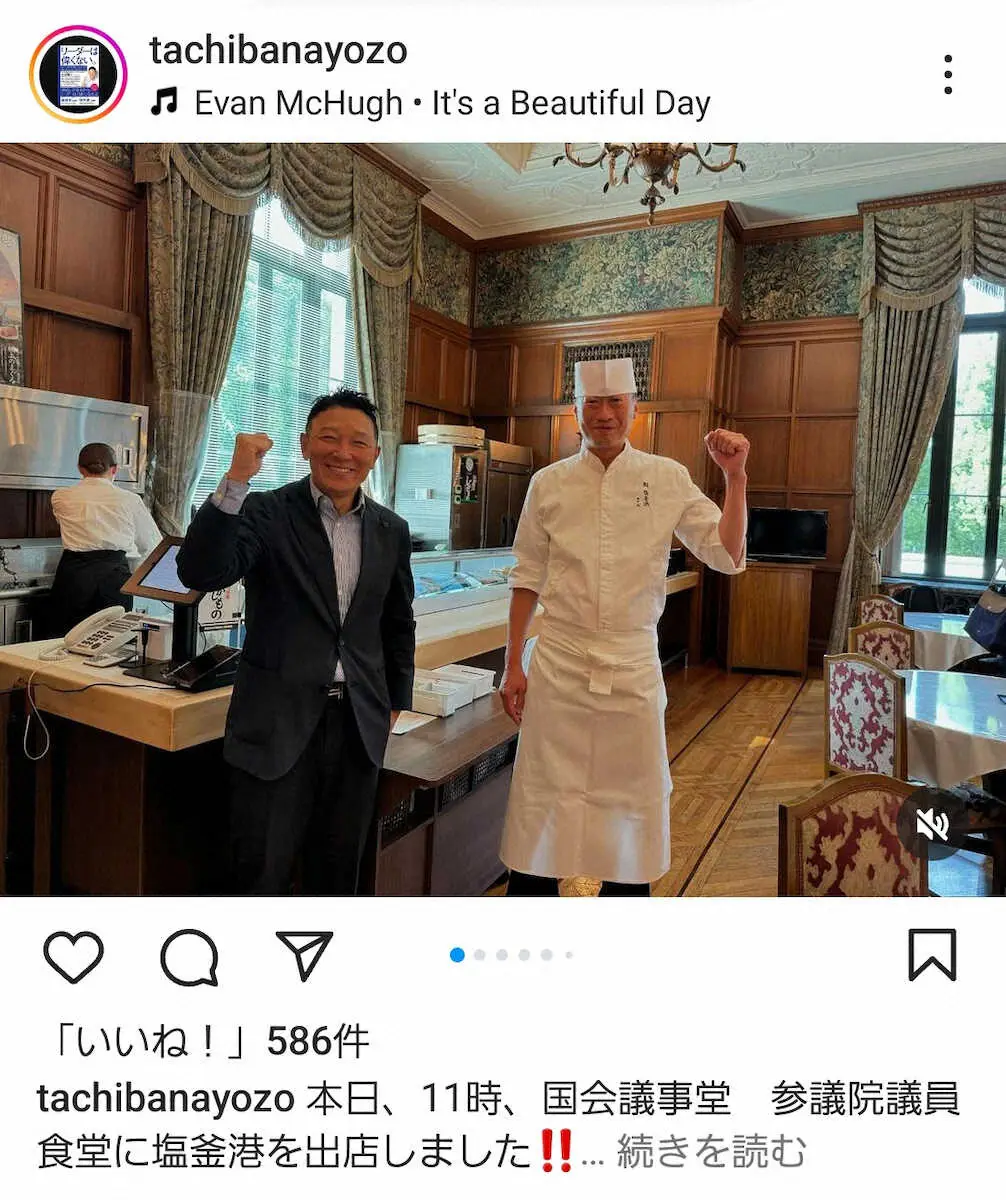 プロ野球・楽天の元球団社長の立花陽三氏(53)が11日、自身のインスタグラムを更新し、社長を務める寿司店「廻鮮寿司 塩釜港」の新店舗が国会議事堂内にオープンしたことを報告。「本日、11時、国会議事堂 参議院議員食堂に塩釜港を出店しました!!」と投稿し、職人とガッツポーズする写真も掲載した。
