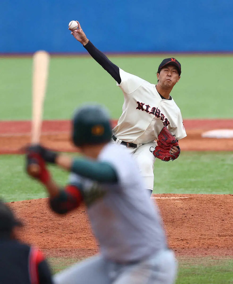 日大は来秋ドラフト候補のエース右腕・市川が2安打1失点完投で今季3勝目を挙げた。6回以外を無安打に封じるなど、テンポのいい投球でわずか89球で投げ抜き「ストレートも変化球も丁寧に低めに集め、ストライク先行で投げられた結果です」とうなずいた。