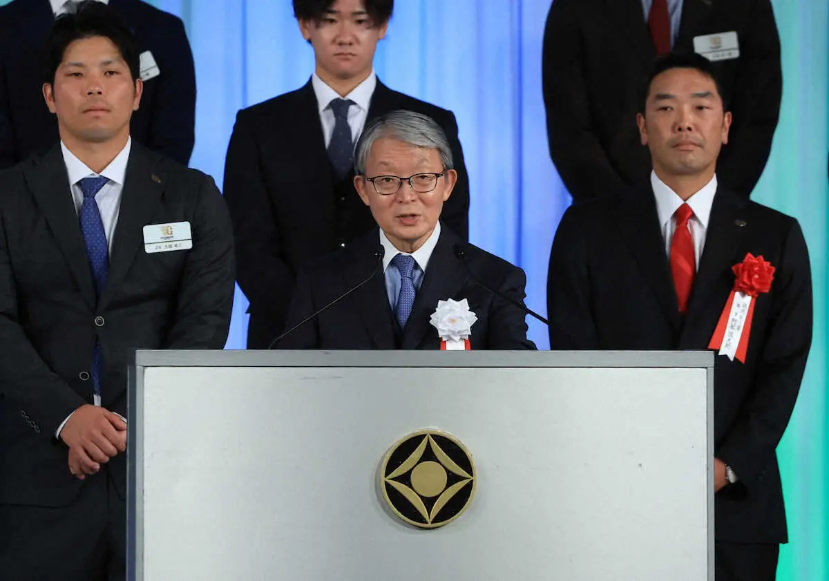 <巨人優勝祝賀会>あいさつする山口オーナー(球団提供)