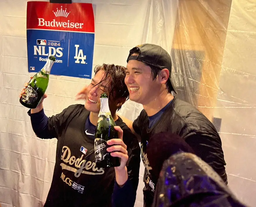 シャンパンファイトで記念撮影するドジャース・大谷(右)と山本(撮影・柳原 直之)